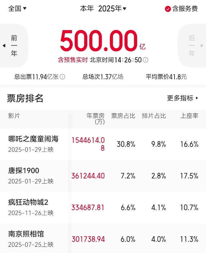 2024年中国年度票房仅为425.02亿元,今年在开年《哪吒之魔童闹海》为代表的春节档的强势拉升下,暑期档有《南京照相馆》、《浪浪山小妖怪》和《捕风追影》中程涡轮增压,年末更有《疯狂动物城2》一路狂飙至30亿+,12月13日,在热门大片《阿凡达:火与烬》尚未公映的前提下,2025年年度票房就轻松突破500亿元大关,也成为2017-2019年和2023年后,中国影史年度票房第五个500亿+。